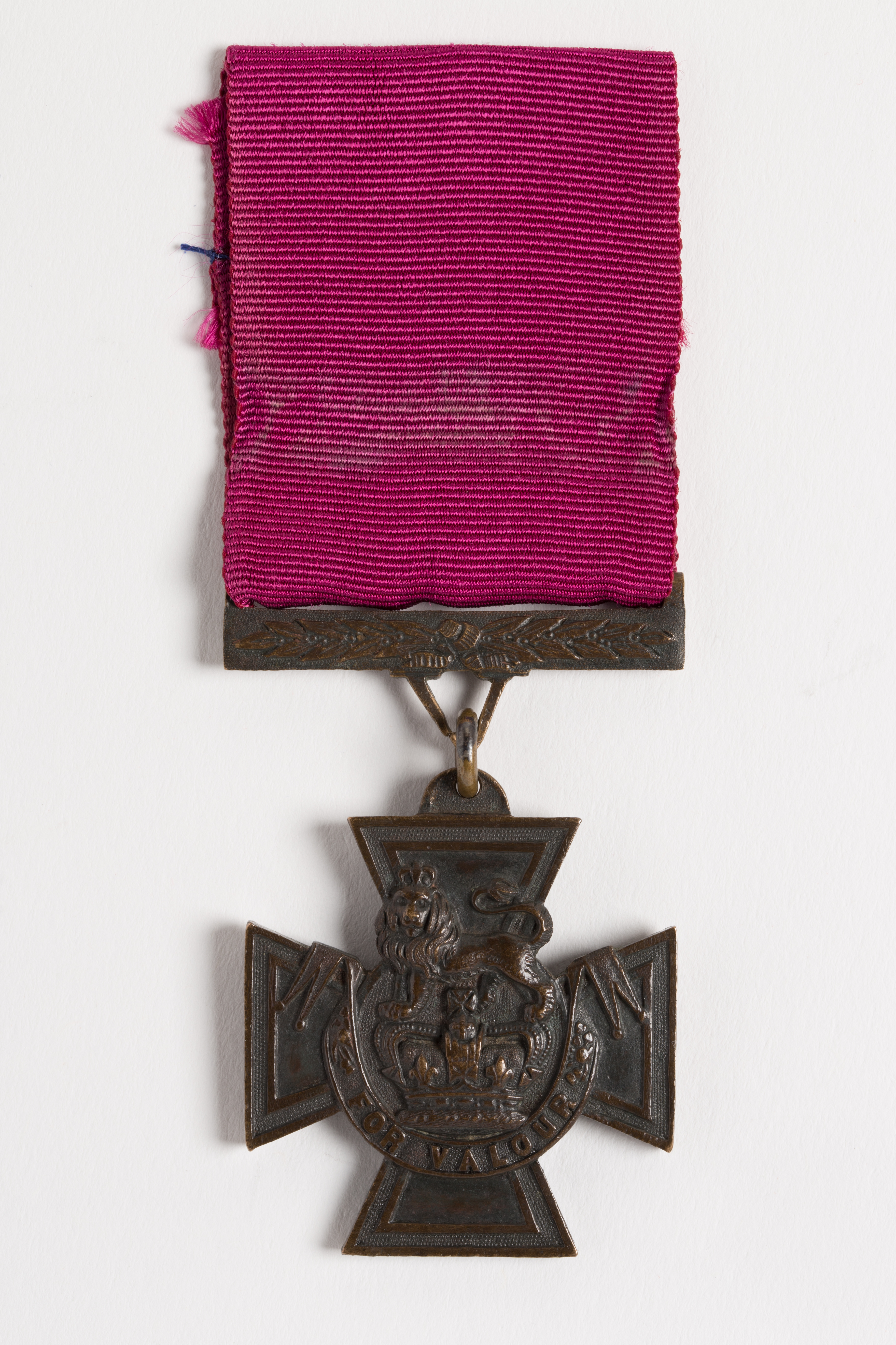 English: Victoria Cross awarded to Ensign Charles Pye, 53rd Regiment bronze cross patte, fixed loop and ring suspension attached to straight suspension bar (with V-lug) ornamented with laurel leaves, with ribbon obverse- bronze cross patte with line rim, at centre a crown surmounted by crowned lion, scroll below with motto- FOR VALOUR reverse- engraved with details of recipient and date of action recipient's name engraved on reverse suspension bar- ENSIGN CHARLES PYE - 53RD. REGT date engraved on reverse of medal- 17 NOVR. - 1857 ribbon- crimson grosgrain